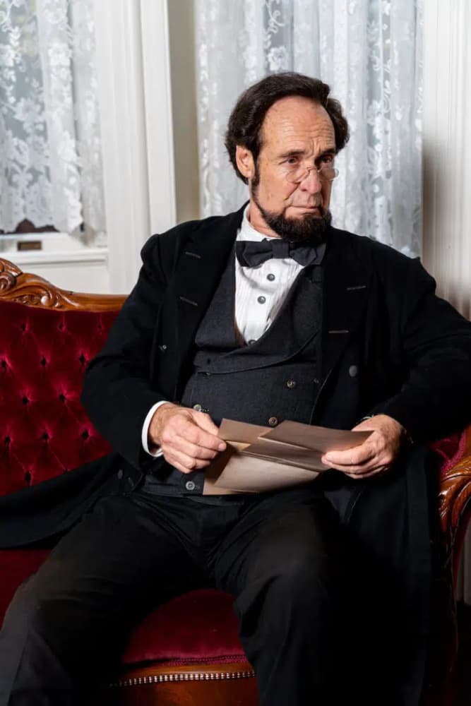 Mr. Boggs, as Lincoln, on the red velvet couch in the Vrooman Mansion parlor