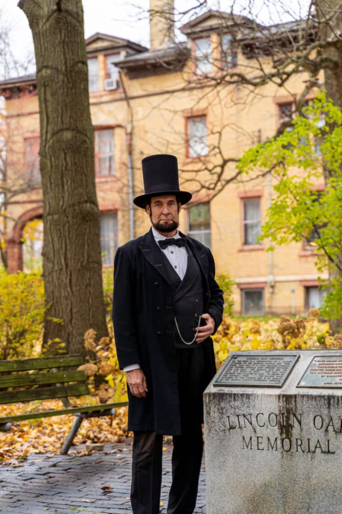 National Historic Interpreter Mr. Dennis Boggs in front of the Lincoln Oak Memorial in Bloomington, Illinois.