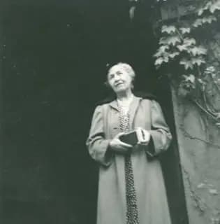 Julia Vrooman stands on the side porch of the Mansion. Could she be waiting for someone?