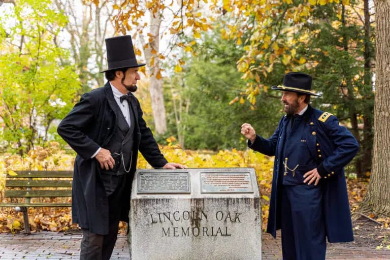 Historic interpreters, Mr. Dennis Boggs as Abraham Lincoln, and Dr. Curt Fields as Ulysses S. Grant in front of the Lincoln Oak Memorial.