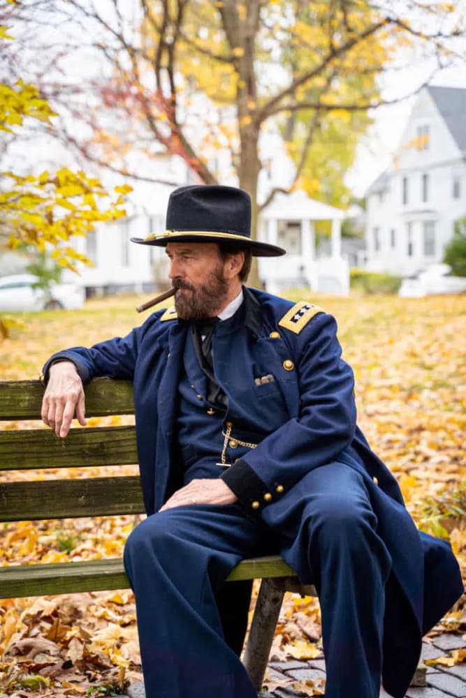 Dr. Curt Fields, as Ulysses S. Grant, sits on the bench behind Vrooman Mansion in Bloomington, Illinois