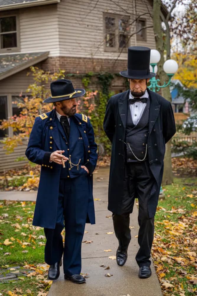 Historic interpreters Dr. Fields as Grant, and Mr. Boggs as Lincoln, walk from the Carriage House toward Vrooman Mansion